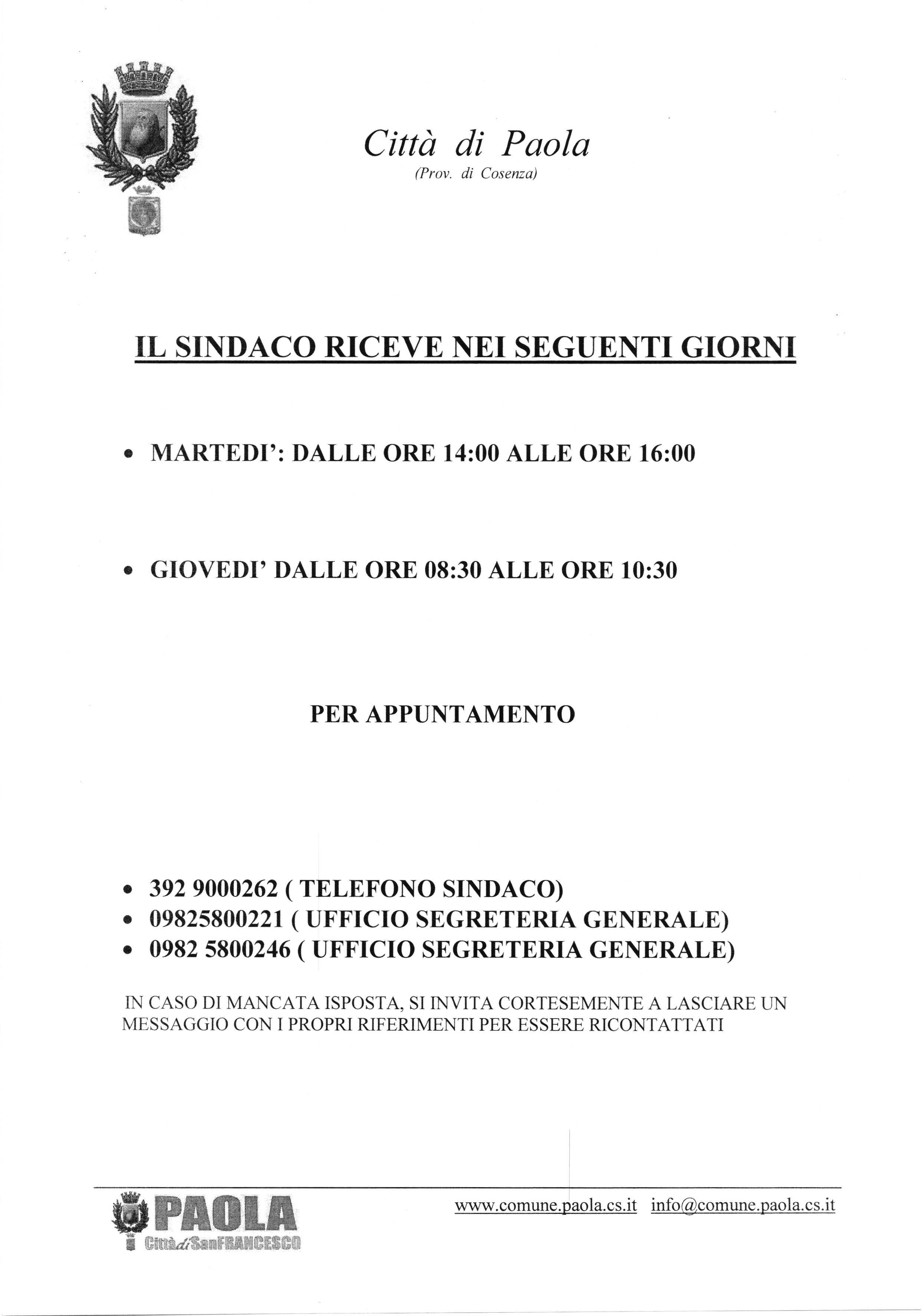 Orari ricevimento Sindaco